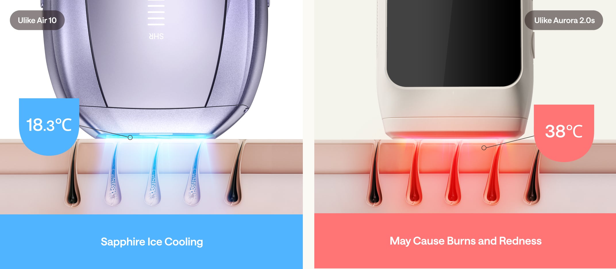 IPL hair removal is generally considered to be much less painful and nearly as effective as laser hair removal. Additionally, Ulike is the company that employs Sapphire Ice-Cooling technology to ensure nearly Painless sessions.