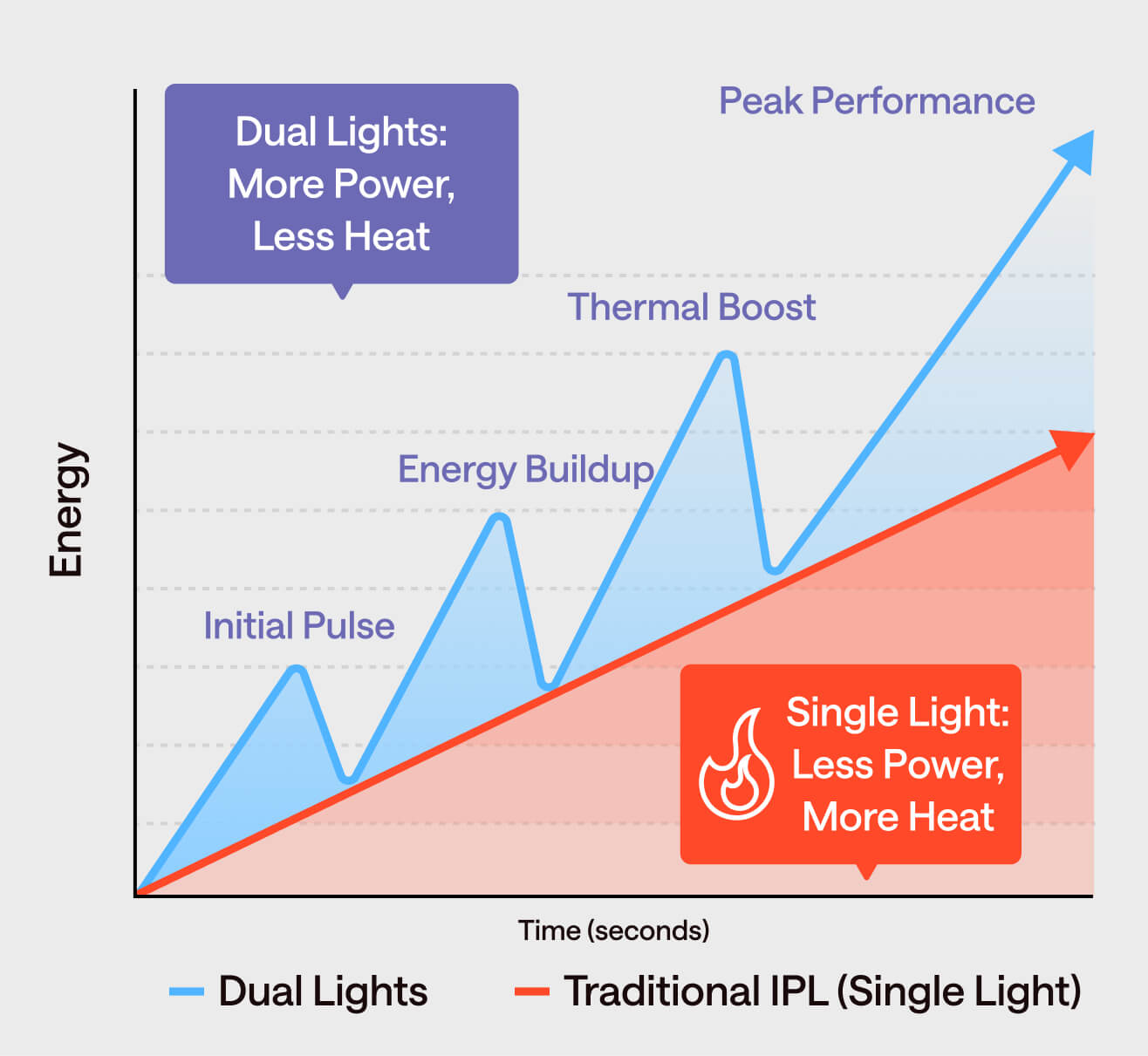 Dual Lights combine higher energy, faster treatment times, and stable heat control for safer, more efficient hair removal, making IPL more effective and suitable for even sensitive skin types.